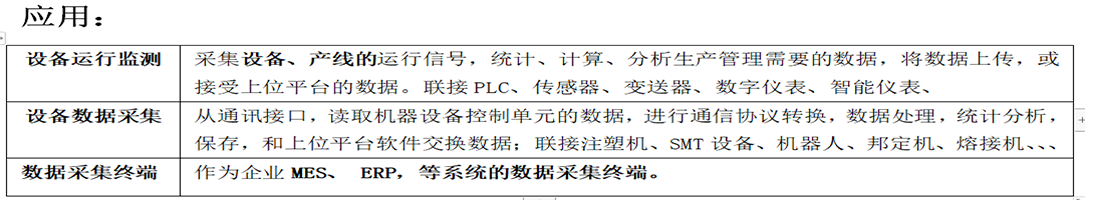 1、 采集:運(yùn)行狀態(tài)(啟動(dòng)、運(yùn)行、待機(jī)、停機(jī)、故障、試機(jī));產(chǎn)量;工藝參數(shù)(轉(zhuǎn)速、時(shí)間、壓力、溫度、流量、位移、振動(dòng));能耗(用電參數(shù)及電能消耗,汽、氣、水消耗);
