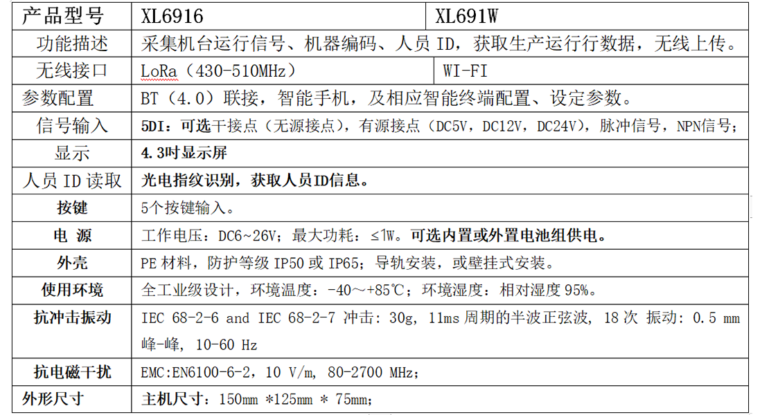 XL69機(jī)臺(tái)監(jiān)控裝置,采集機(jī)臺(tái)、工位人、機(jī)生產(chǎn)運(yùn)行信號(hào):機(jī)器運(yùn)行狀態(tài)、人員ID信息及操作時(shí)間數(shù)據(jù),獲取機(jī)器、人員生產(chǎn)運(yùn)行數(shù)據(jù),并對(duì)機(jī)臺(tái)的運(yùn)行數(shù)據(jù)進(jìn)行邊緣計(jì)算,統(tǒng)計(jì)、分析機(jī)臺(tái)的設(shè)備效率、時(shí)間效率、品質(zhì)效率,及綜合效率。通過(guò)無(wú)線方式,上傳獲取的數(shù)據(jù)。