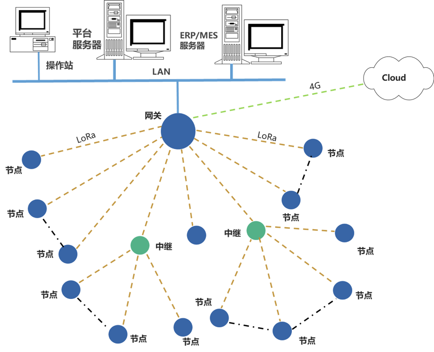 LoRa網(wǎng)絡(luò)是自定義通訊參數(shù)的LoRa通信網(wǎng)絡(luò);設(shè)計(jì)有中繼可延長(zhǎng)無(wú)線傳輸距離。物聯(lián)網(wǎng)關(guān)對(duì)節(jié)點(diǎn)的數(shù)據(jù)進(jìn)行通信協(xié)議轉(zhuǎn)換,可選多種通信接口、不同的通信協(xié)議,同時(shí)上傳數(shù)據(jù)至多個(gè)平臺(tái)服務(wù)器。