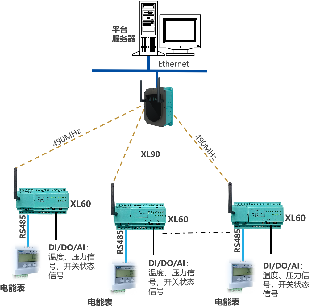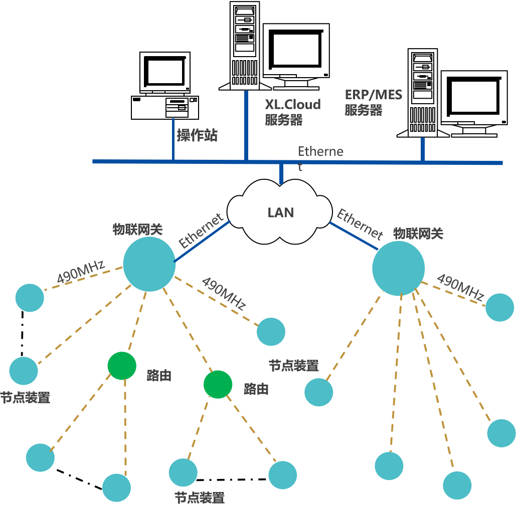節(jié)點裝置(智能采集裝置/智能采集終端),通過490MHz上傳數(shù)據(jù)至物聯(lián)網(wǎng)關(guān),網(wǎng)關(guān)通過Ethernet接入企業(yè)內(nèi)部LAN,推送設(shè)備生產(chǎn)數(shù)據(jù),至企業(yè)生產(chǎn)監(jiān)控平臺