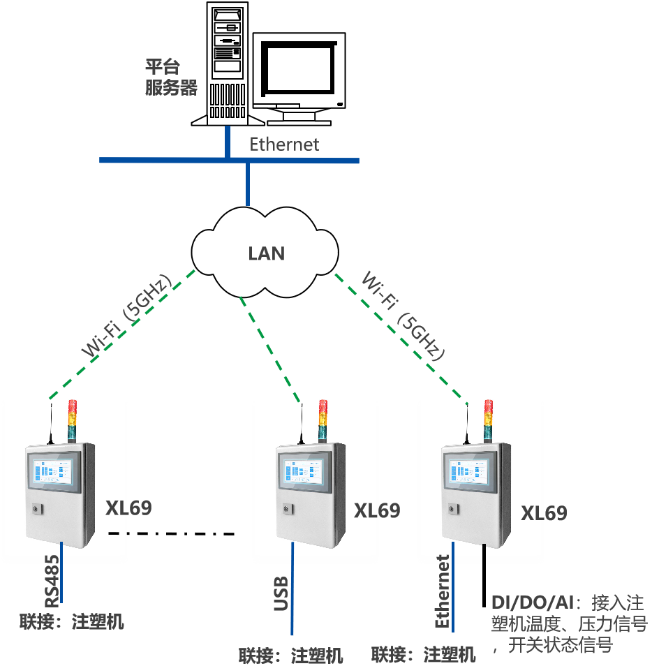 XL69智能采集終端,是系統(tǒng)的核心裝置,對采集的信號、數(shù)據(jù),進行處理、統(tǒng)計、計算,并生成單機設(shè)備的數(shù)據(jù)庫,通過企業(yè)內(nèi)部LAN,推送數(shù)據(jù)至企業(yè)生產(chǎn)監(jiān)控平臺
