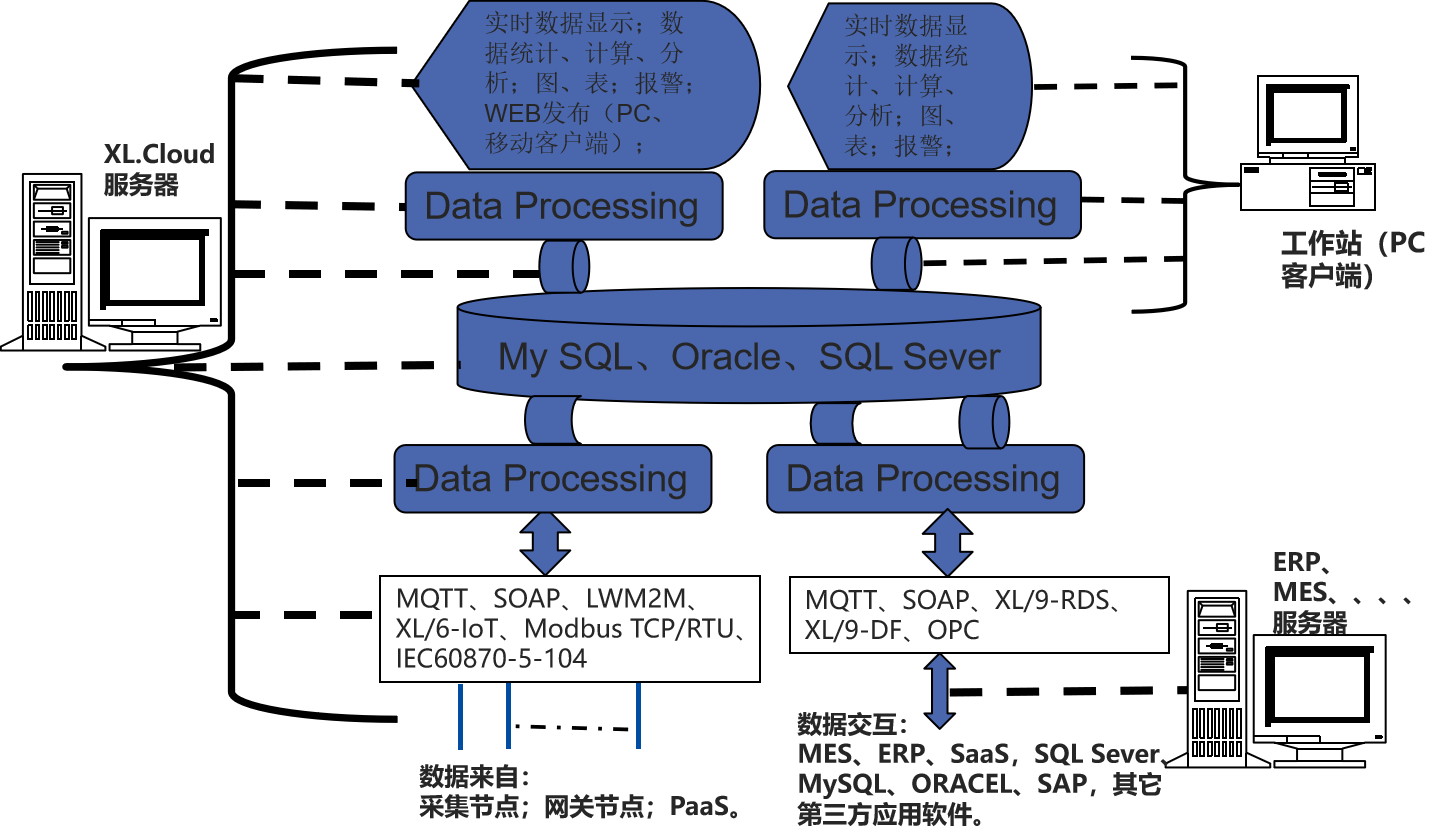 支持MQTT、SOAP,XL/6-IoT、XL/9-DB、XL/9-RDS,等等通信協(xié)議,并可和第三方數(shù)據(jù)庫(kù),Oracle、SAP等交換數(shù)據(jù);