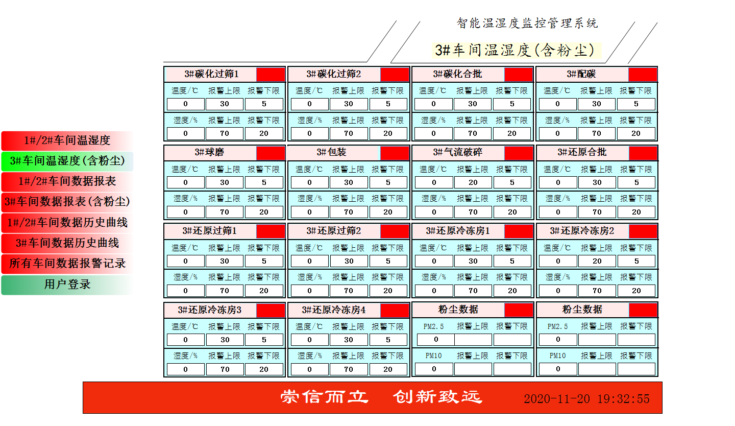 通過無線(Lora)傳輸,采集車間環(huán)境溫濕度和粉塵的數(shù)據(jù)并上傳到服務(wù)器電腦上,在服務(wù)器電腦上的平臺(tái)軟件上展示: