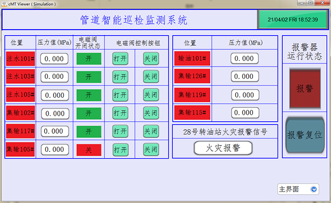 當出現(xiàn)壓力過大時,中控室會發(fā)出聲光報警提醒工作人員,工作人員可通過觸摸屏上的按鈕關(guān)閉或打開閥門,防止原油泄漏。大大降低的安全事故,節(jié)省了人工成本。