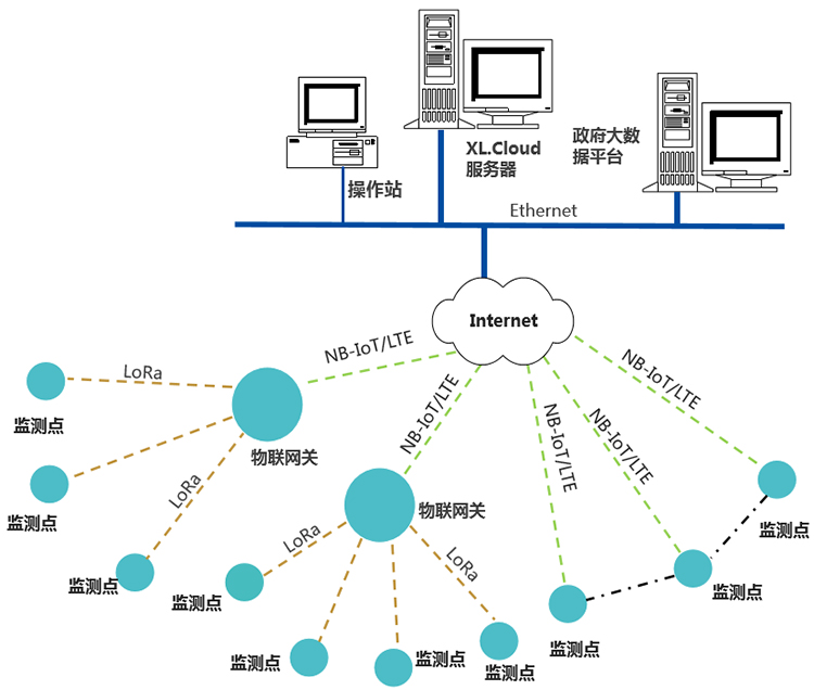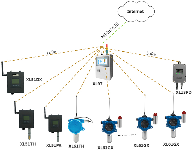 在需要監(jiān)測(cè)環(huán)境參數(shù)的場(chǎng)景,選擇XL97網(wǎng)關(guān)終端,讀取傳感器的數(shù)據(jù),通過4G/NB推送至監(jiān)控平臺(tái);