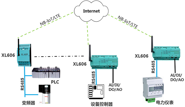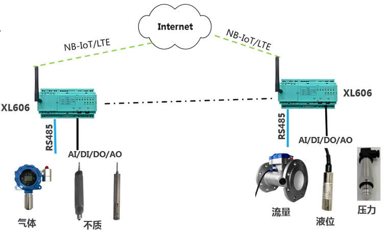 選擇XL60主機(jī)模塊,加I/O模塊,采集環(huán)保設(shè)備的運(yùn)行信號(hào);通過RS485/Ethernet接口,從機(jī)器控制器、PLC讀取設(shè)備運(yùn)行數(shù)據(jù);通過NB/4G上傳數(shù)據(jù)到平臺(tái),4G網(wǎng)絡(luò)信號(hào)更穩(wěn)定;