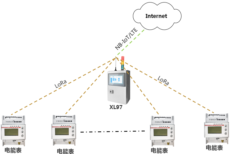 對(duì)于一家企業(yè),需要對(duì)多臺(tái)環(huán)保設(shè)備用電數(shù)據(jù)進(jìn)行采集的情況,在每個(gè)用電監(jiān)測(cè)點(diǎn),配置1塊DTSD3366/XL無(wú)線智能電表,采集該回路的用電數(shù)據(jù),上傳至XL97網(wǎng)關(guān)終端(數(shù)據(jù)傳輸終端);