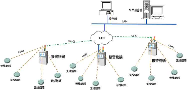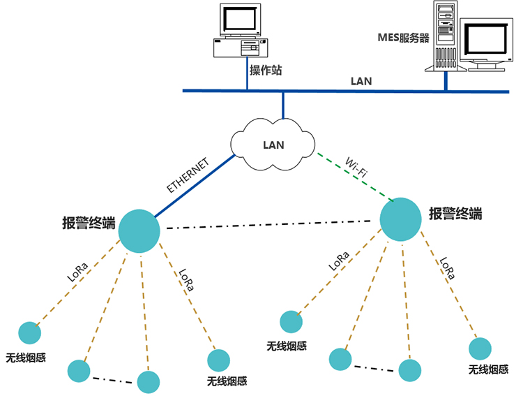報(bào)警終端通過無線,獲取管轄區(qū)域內(nèi),煙感監(jiān)測(cè)點(diǎn)的數(shù)據(jù),通過ETHERNET,或Wi-Fi,推送數(shù)據(jù)至工廠MES服務(wù)器,通信協(xié)議為工廠MQTT數(shù)據(jù)格式。