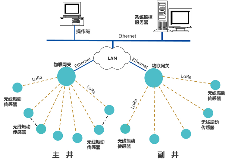 無線振動傳感器,通過LoRa上傳數(shù)據(jù)至物聯(lián)網(wǎng)關(guān),網(wǎng)關(guān)通過Ethernet,接入LAN,推送數(shù)據(jù)至設(shè)備狀態(tài)監(jiān)測管控服務(wù)器。