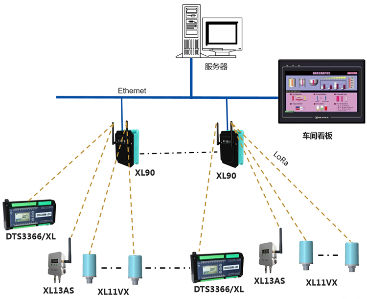 基于XIoT技術(shù)的回流爐運行狀態(tài)數(shù)據(jù)集系統(tǒng),選擇DTSD3366/XL電力監(jiān)測儀表,XL13AS無線風(fēng)速傳感器、XL11VX無線振動傳感器,采集回流爐運行數(shù)據(jù),無線上傳數(shù)據(jù)至XL90物聯(lián)網(wǎng)關(guān):