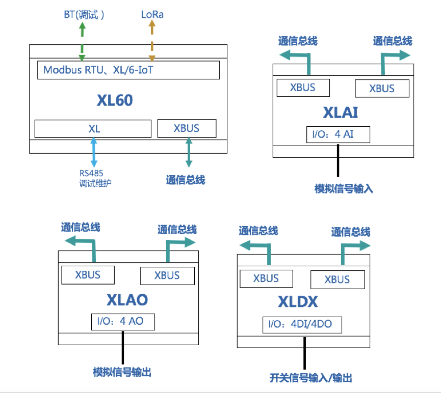 I/O模塊可選:XLDX(4DI/0-4DO)、XLAI(0-4AI)、XLAO(0-4AO) 。