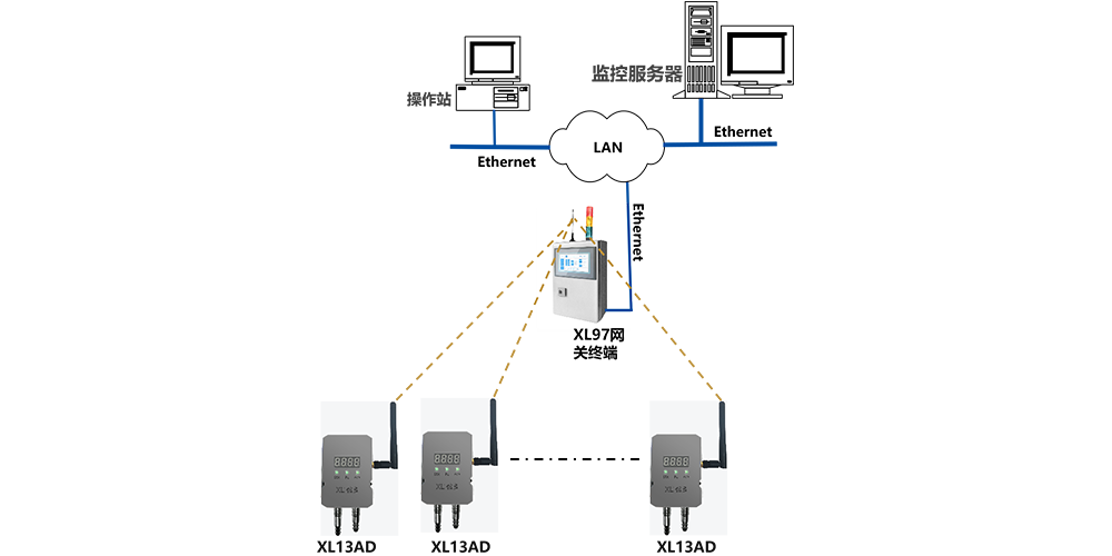 現(xiàn)場需要局部集中監(jiān)視時(shí),可配置XL97網(wǎng)關(guān)終端,讀取區(qū)域內(nèi)XL13AD上傳的數(shù)據(jù),分析處理、顯示、報(bào)警,并轉(zhuǎn)發(fā)至監(jiān)控中心服務(wù)器。