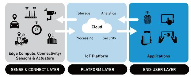 物聯(lián)網(wǎng)大致分為3 層。第1 層為感知和連接層,用于將物聯(lián)網(wǎng)硬件連接到執(zhí)行數(shù)據(jù)處理和存儲的網(wǎng)絡(luò)應(yīng)用。第2 層為平臺層,用于保護、處理、分析和存儲數(shù)據(jù)。第3層為最終用戶層,最終用戶在此使用應(yīng)用監(jiān)控并解讀數(shù)據(jù)。此外,最終用戶還可以使用應(yīng)用發(fā)送指令。