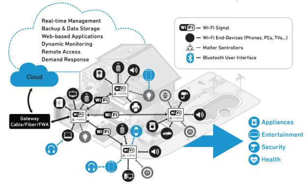 Matter有助于消費類物聯(lián)網(wǎng)互聯(lián)生態(tài)系統(tǒng)輕松實現(xiàn)即插即用,從而簡化智能家居和智能辦公環(huán)境。它在互聯(lián)網(wǎng)協(xié)議之上提供一個層,其中包括一組適用于所有Matter連接設(shè)備的預(yù)定義方案。這使得 Matter 設(shè)備能夠了解它們正在與什么類型的對象進行通信,以及這些對象有什么樣的功能。Matter 使物聯(lián)網(wǎng)終端設(shè)備或節(jié)點能夠與各種 Wi-Fi 網(wǎng)絡(luò) pod 輕松通信。