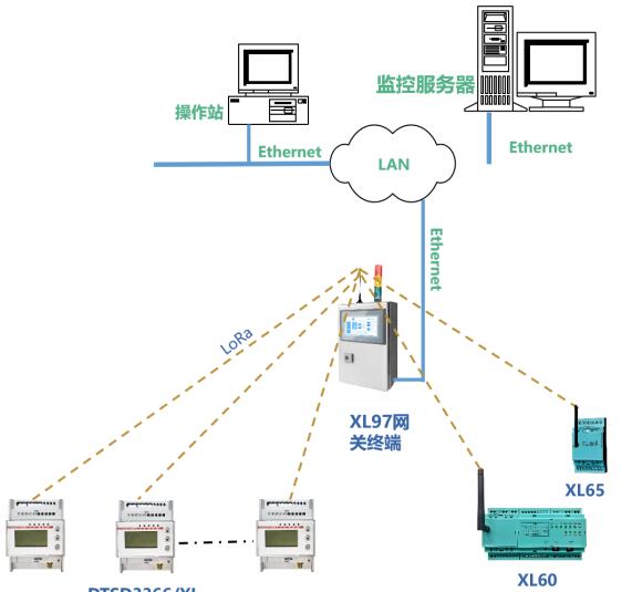 XL65無(wú)線(xiàn)上傳數(shù)據(jù)至現(xiàn)場(chǎng)監(jiān)控終端;或上傳至XL90物聯(lián)網(wǎng)關(guān)。