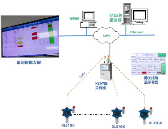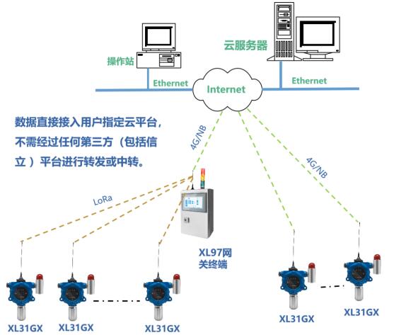 l XL31GX智能氣體檢測儀,通過LoRa接入網(wǎng)關終端,網(wǎng)關終端通過4G接入云平臺。