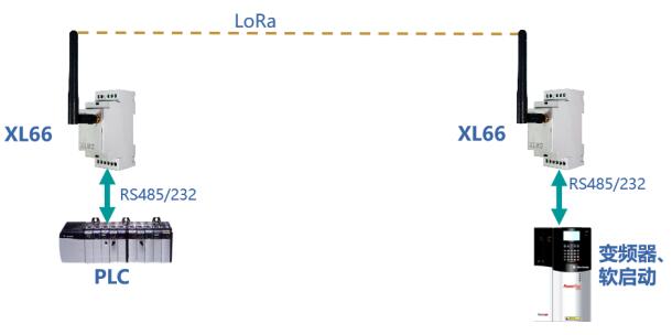 對于任意2臺帶RS485、232通信接口的設備,可分別與一臺XL66通過其RS485、232通信接口連接,其數(shù)據通過這2兩臺XL66,以無線通信方式實現(xiàn)數(shù)據透傳,從而免去現(xiàn)場繁雜的施工布線。