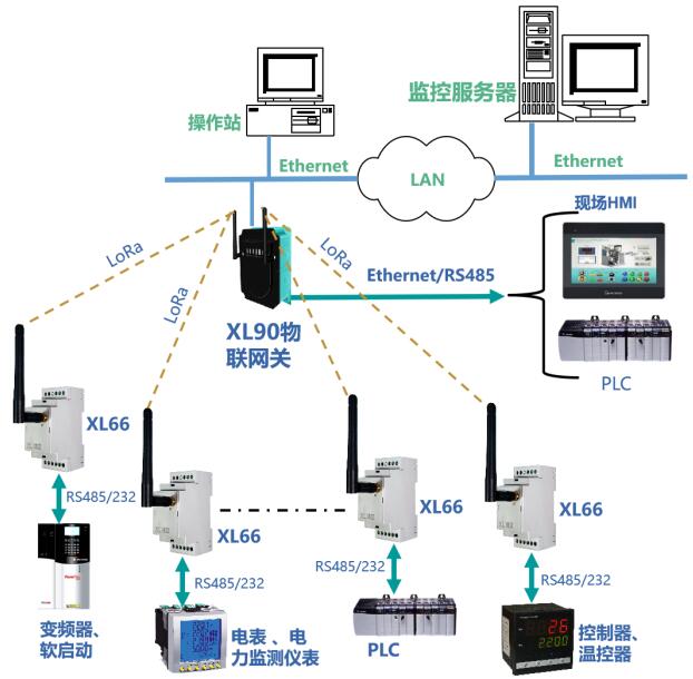 帶RS485或232通信接口的控制器、二次儀表、變送器等設備,通過通信接口與XL66連接,XL66通過LoRa無線通信方式將數(shù)據上傳至XL90或XL95物聯(lián)網關,網關通過以太網或RS485,上傳數(shù)據至監(jiān)控平臺、PLC、觸摸屏、控制器等設備。從而實現(xiàn)有線串口設備的無線聯(lián)網。