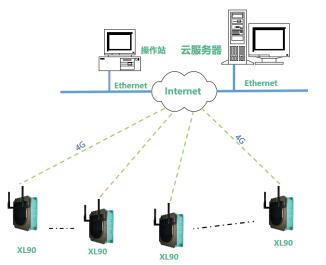 對于安裝分散、距離遠(yuǎn)的監(jiān)測點,可通過XL90網(wǎng)關(guān)構(gòu)建一個小的物聯(lián)網(wǎng)數(shù)據(jù)采集系統(tǒng)。網(wǎng)關(guān)無線讀取區(qū)域內(nèi)各監(jiān)測點的數(shù)據(jù),通過4G推送數(shù)據(jù)至云平臺。