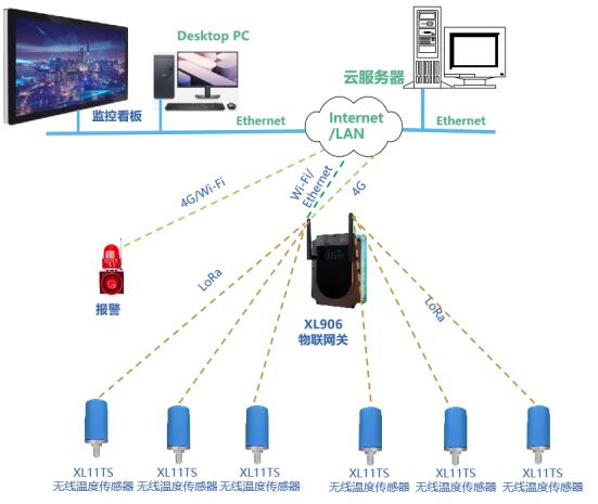 XL11TS無線溫度傳感器等采集節(jié)點,通過LoRa無線傳輸技術將溫度數(shù)據(jù)傳輸至XL906網(wǎng)關;