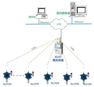 可配XL97網(wǎng)關(guān)終端,增加現(xiàn)場(chǎng)集中監(jiān)視,讀取區(qū)域內(nèi)壓力傳感器數(shù)據(jù),分析處理、顯示、報(bào)警,并轉(zhuǎn)發(fā)至監(jiān)控中心服務(wù)器。