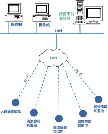 涂裝油漆調(diào)和監(jiān)管系統(tǒng),由監(jiān)管平臺服務(wù)器、油漆調(diào)和操作監(jiān)控終端、電子秤、油漆編碼終端、操作站等構(gòu)成,通過工廠內(nèi)的局域網(wǎng)(WI-FI)進(jìn)行通信連接。