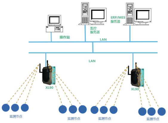 解決方案:XL90物聯(lián)網關無線讀取監(jiān)測節(jié)點的數據,進行處理、協(xié)議轉換,通過以太網(Ethernet)或Wi-Fi,接入局域網轉發(fā)數據至MES、ERP、EMS等工廠數字化平臺。