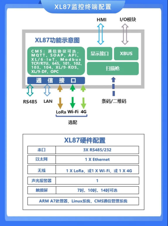 XL87監(jiān)控終端,以一套生產(chǎn)設(shè)備、一條產(chǎn)線、或是多臺(tái)相關(guān)聯(lián)的機(jī)器設(shè)備作為一個(gè)監(jiān)測(cè)對(duì)象,可實(shí)現(xiàn)設(shè)備數(shù)據(jù)采集、運(yùn)行狀態(tài)監(jiān)測(cè)、物料追溯、設(shè)備信息讀取、機(jī)器啟??刂频裙δ?。