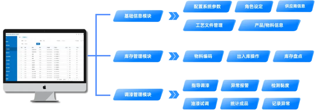 XPMS軟件,由基礎(chǔ)信息、庫(kù)存管理和調(diào)漆管理三大功能模塊組成。軟件按調(diào)漆房的數(shù)量及設(shè)備數(shù)量進(jìn)行授權(quán),多個(gè)調(diào)漆房共用一套軟件平臺(tái)。