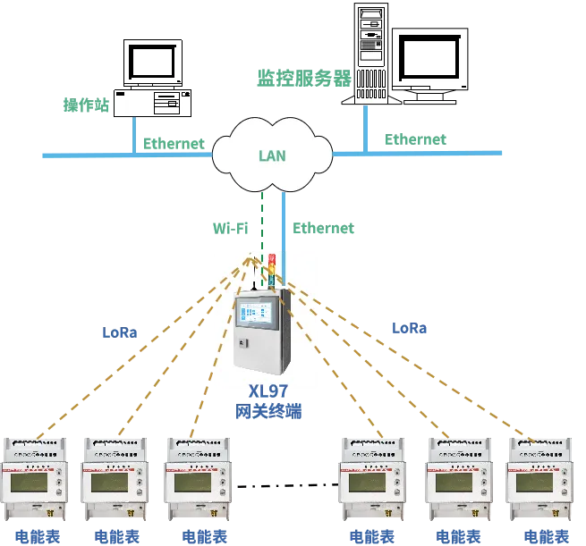 DTSD3366D/XL系列三相電子式電能表,通過LoRa無線傳輸電流數(shù)據(jù)至XL97網(wǎng)關(guān)終端,可實(shí)現(xiàn)就地監(jiān)控;XL97網(wǎng)關(guān)終端通過Ethernet或Wi-Fi推送數(shù)據(jù)至監(jiān)控平臺,實(shí)現(xiàn)遠(yuǎn)程監(jiān)控。