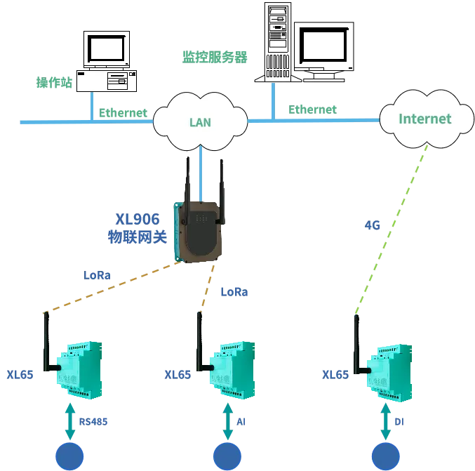 LoRa通信:適合多個監(jiān)測點處于相對集中的區(qū)域范圍內(nèi),監(jiān)測點數(shù)據(jù)通過LoRa上傳至XL90物聯(lián)網(wǎng)關(guān),網(wǎng)關(guān)通過Ethernet、WiFi、4G等通信方式上傳數(shù)據(jù)至監(jiān)控平臺;