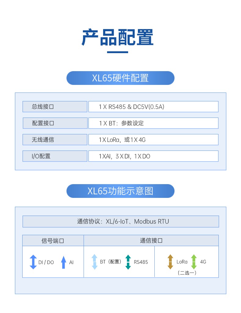 XL65無線低功耗模塊,集成RS485通信口和豐富的I/0口,可實現(xiàn)同時采集1路AI信號、3路DI信號、1路RS485信號,支持多種無線通信方式上傳采集的信號和數(shù)據(jù)??蛇x電池供電,適用于更多供電不便的場景。